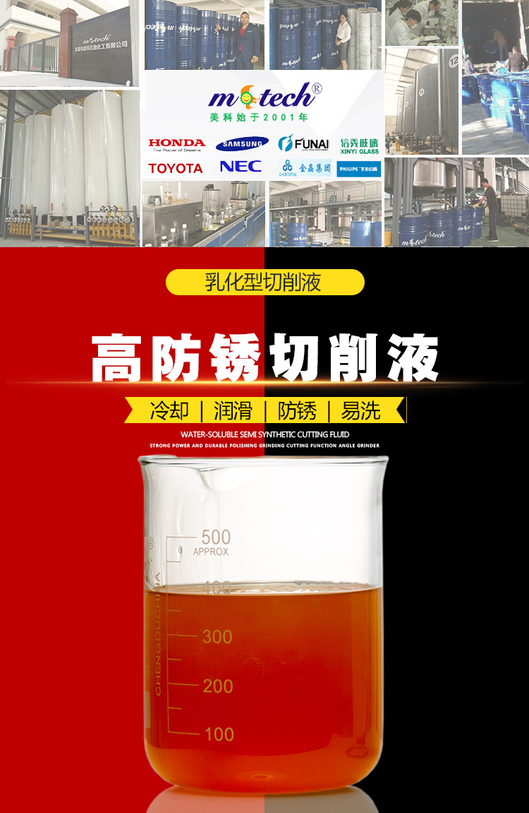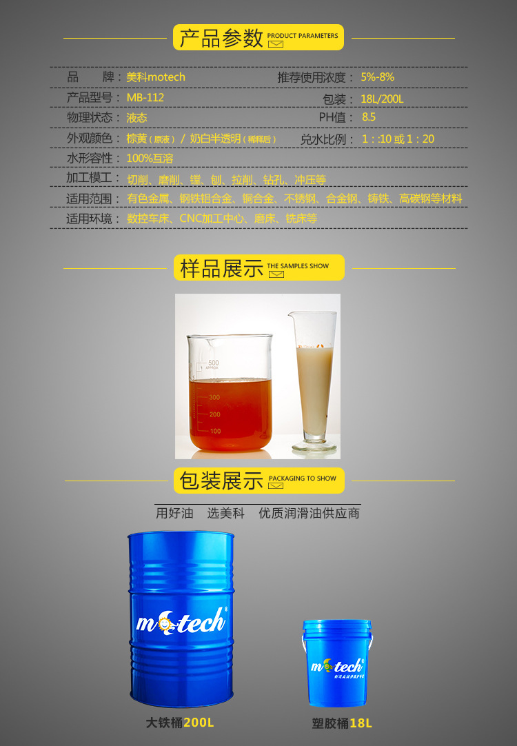 美科®MB 112高防锈乳化切削液,适用于黑色金属机械加工包括:车削、钻孔、攻丝、铰孔、切齿和拉削。在许多加工操作中、可以代替纯油进行重负荷加工。