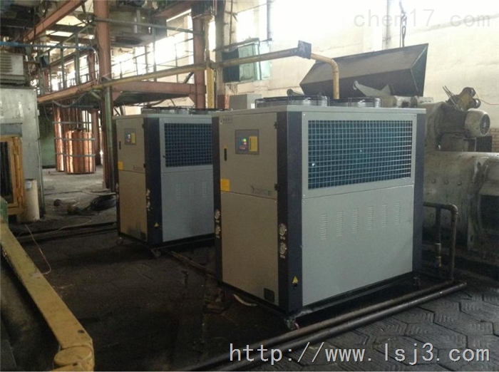 风冷式冷水机与一般用水冷却设备是不同的,冷水机具有独立的制冷系统,会受气温及环境的影响.风冷水机冷水机主要由压缩机,冷凝器,蒸发器,膨胀阀及电控系统组成,其工作原理是压缩机从蒸发器中吸入低温低压的气态冷媒,将其压缩,形成高温高压液态进入冷凝器进行散热,转换成常温高压饱和蒸汽,通过膨胀阀的喷射,进入蒸发器,转化为低温低压的气体,与蒸发器中的水进行热交换,吸收水中的热量,从而产生冷冻水,通过循环泵进入需要冷却的设备或是产品,完成制冷工艺.